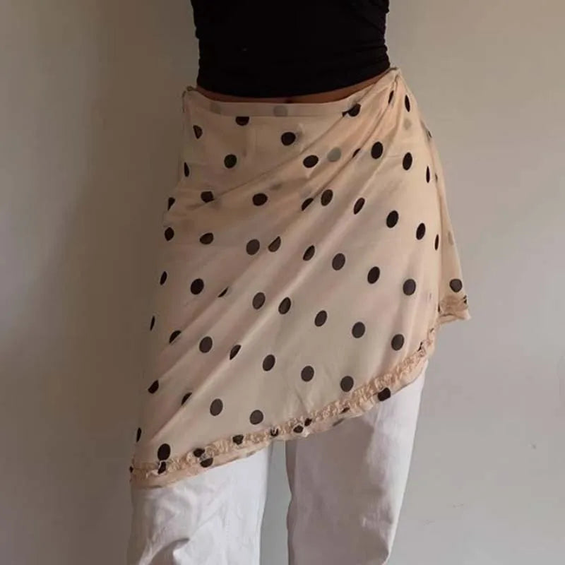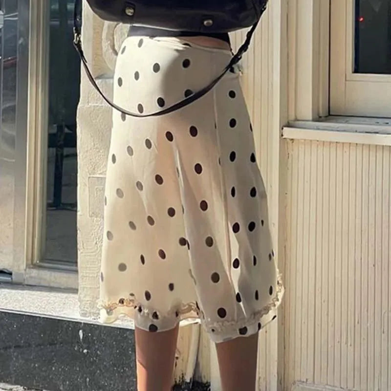 90s Vintage Polka Dot Midi Skirts Y2k Coquette Low Waist See Through A-line Skirt Women Ladies Beach Vacation Frill Trim Skirts