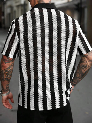 Trendy Mens Knitted Shirts 2025 Summer Casual Hollow Out Breathable Cardigans Men Beach Fashion Short Sleeve Striped Knit Shirt