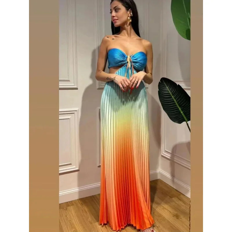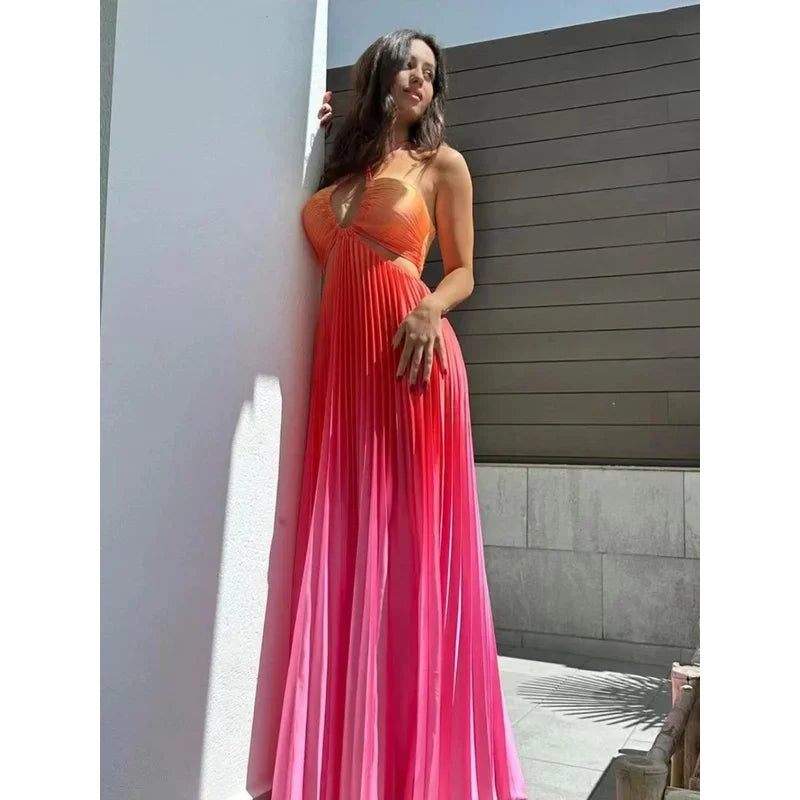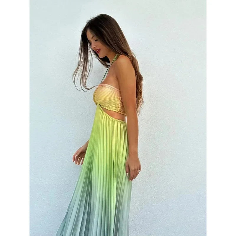 Bonny Summer Gradient Halter Pleated Women Maxi Dresses 2024 Sexy Off Shoulder Backless Wrap Chest Sundress Beach Vacation Robes