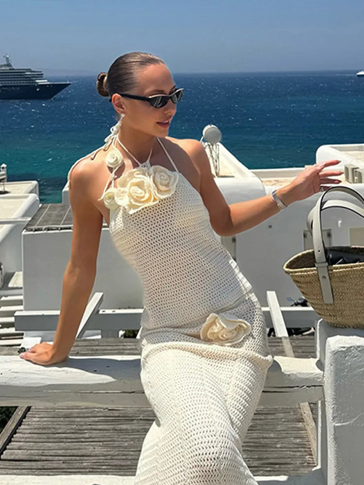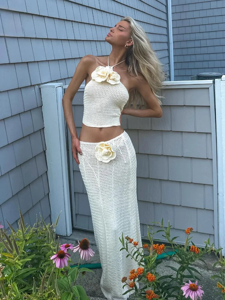 Chic 3d Flowers Sleeveless Halter Lace Up Knit Tops Suit Sexy Hollow Out See Through Slim Printed Skirt Set 2025 Vacation Outfit