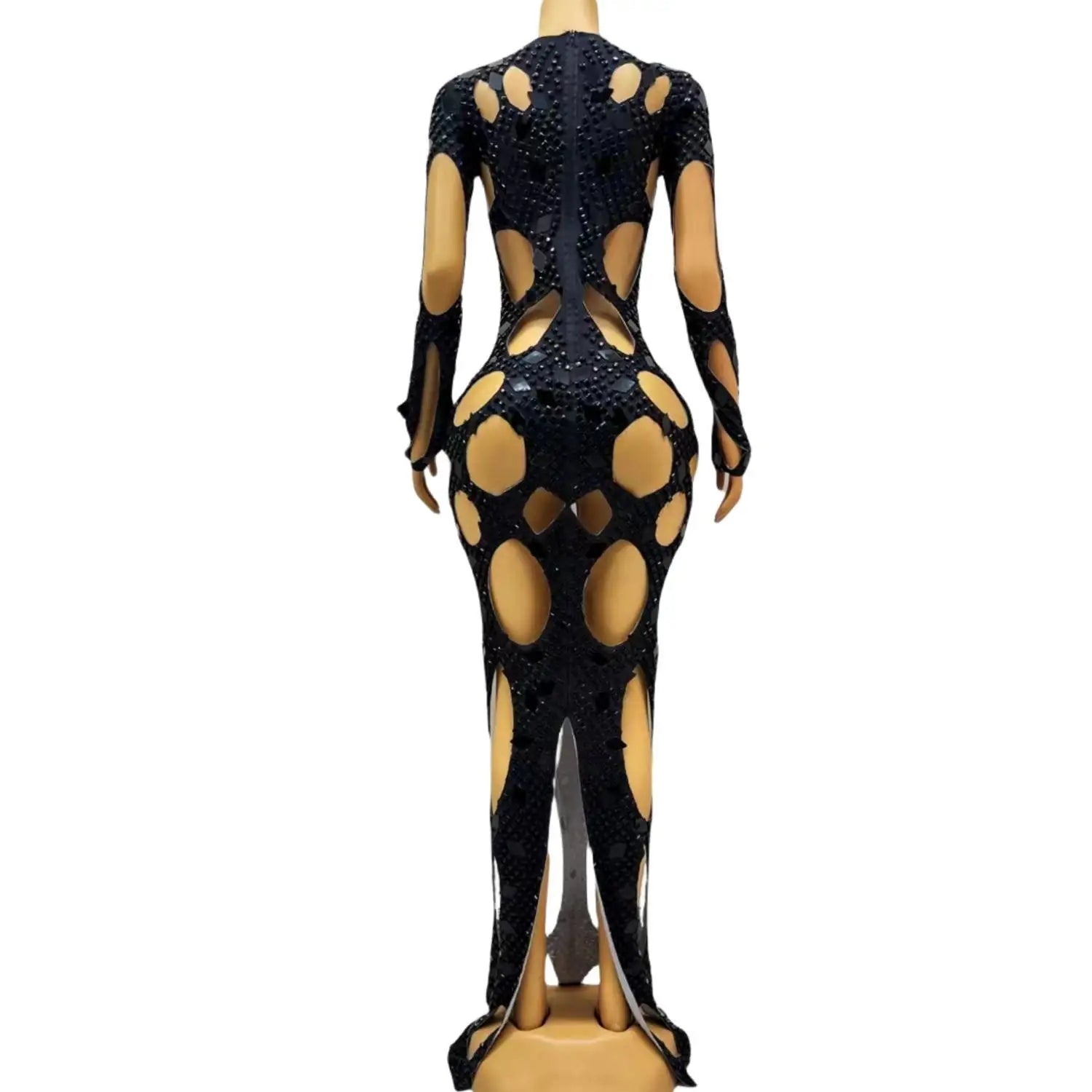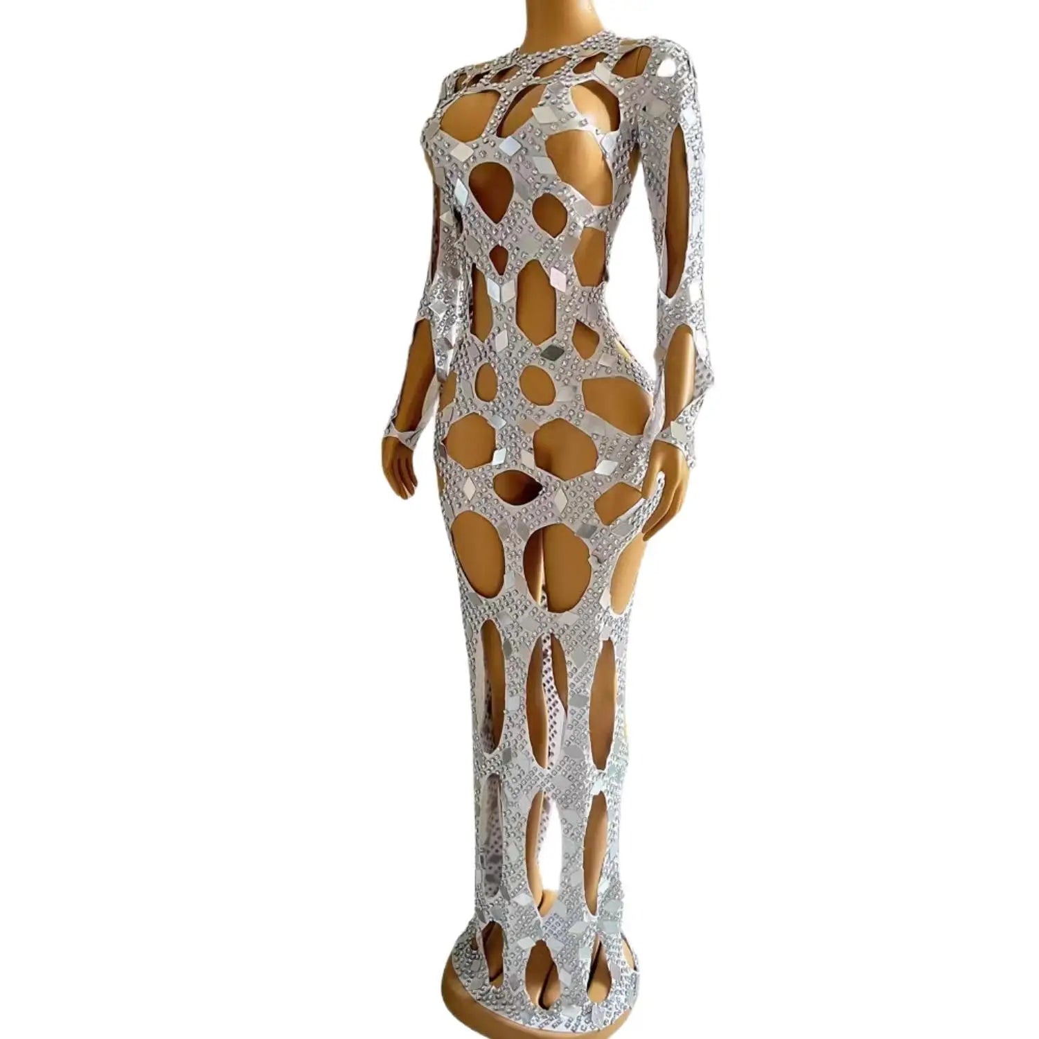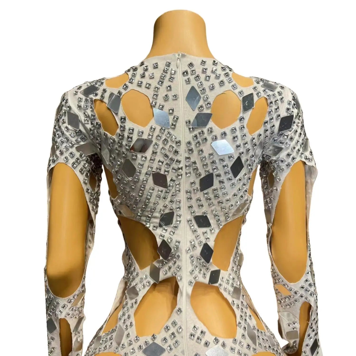 Sexy Flashing Silver Mirrors Rhinestones Cut-out Dress Birthday Prom Shining Outfit Evening Celebrate Prom Gala Gowns Dongdong