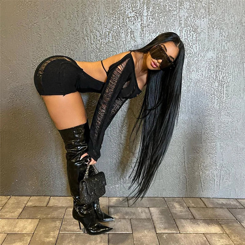 Summer One Word Collar Rip Romper Women See Through Backless Sexy Skinny Fitness Playsuit Activity Party Clubwear