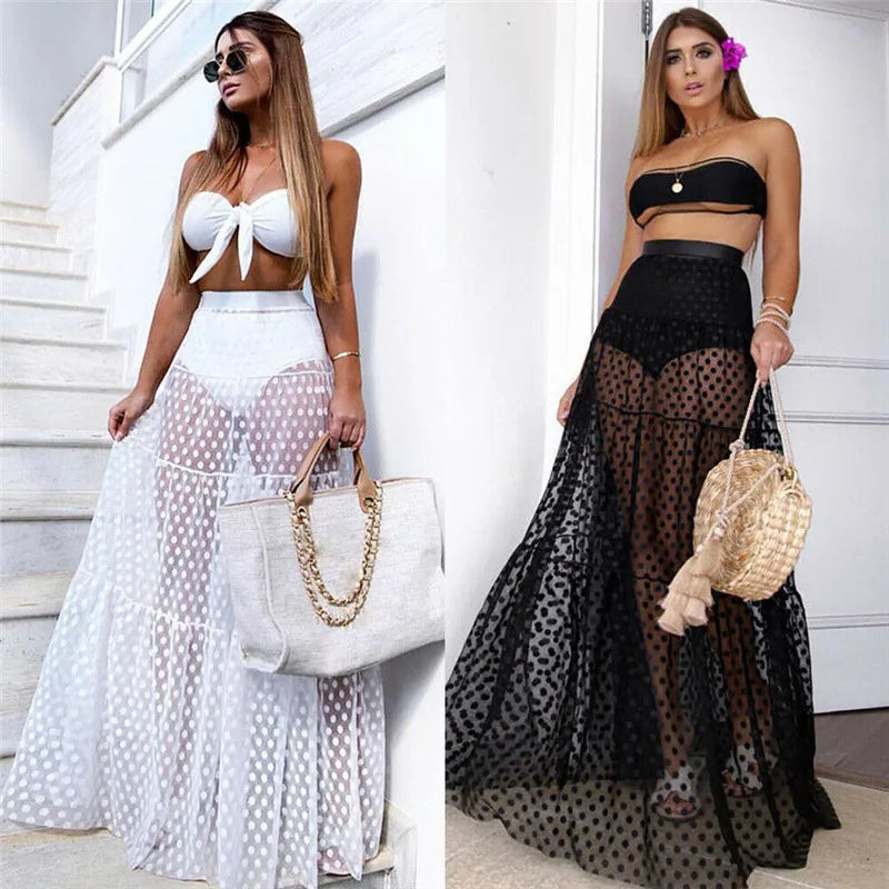 Summer Swimwear Women Maxi Skirt See Through Polka Dot Pleated Retro Swimsuit Bikini Cover Up Elastic Waist Bathing Skirts