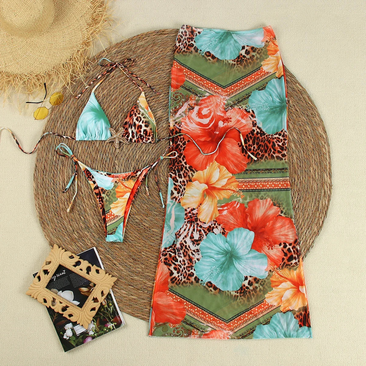 Weird Puss Beach Style Women 3Piece Set Swimsuit Colorful Print Bandage Bra+Briefs+Maxi Skirts Vacation Midnight Club Party Suit