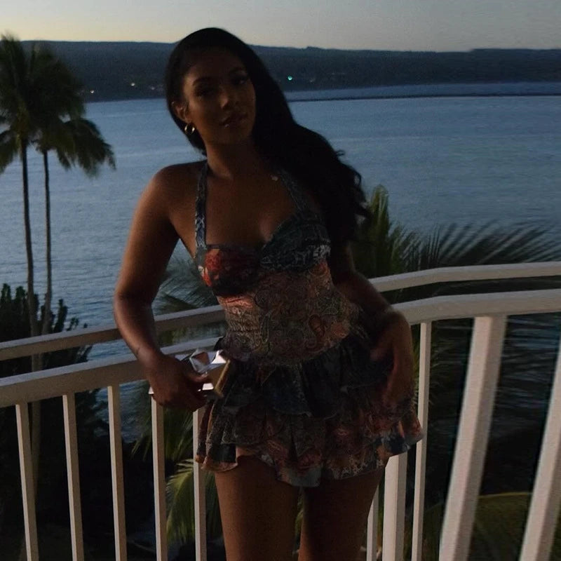 Weird Puss Colorful Print Dress Women Halter Backless Sleeveless Ruched Ruffles Tierred Vacation Beach Party Trend Mini Bodycon