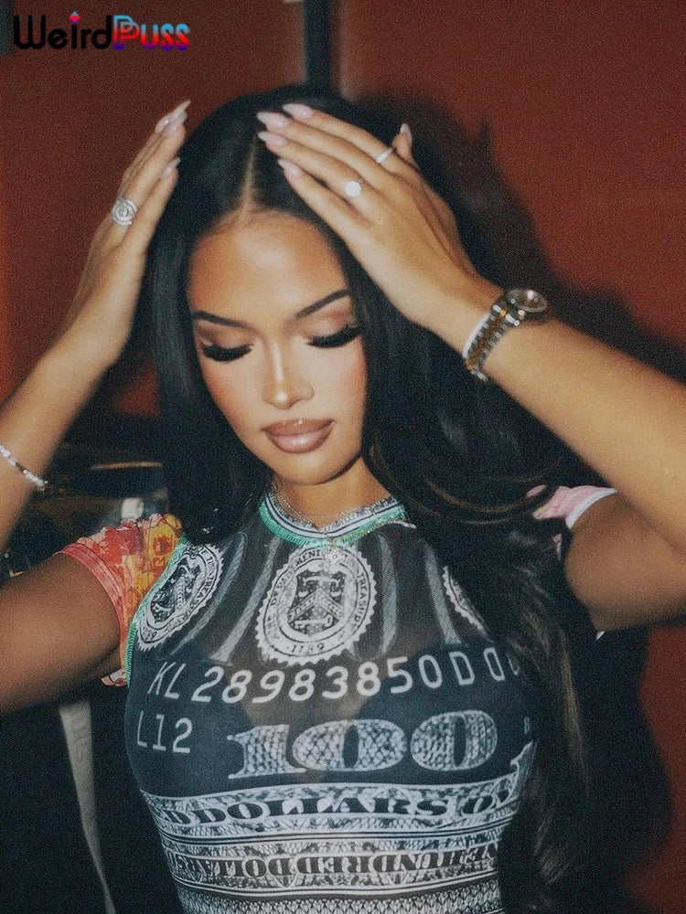 Weird Puss See Through Crop Tops Women Numeral Print Short Sleeve O-Neck Sexy Club Patchwork Streetwear Skinny Hot Girls Tees