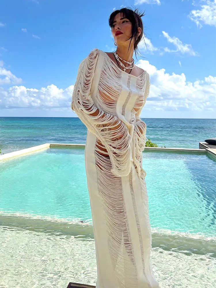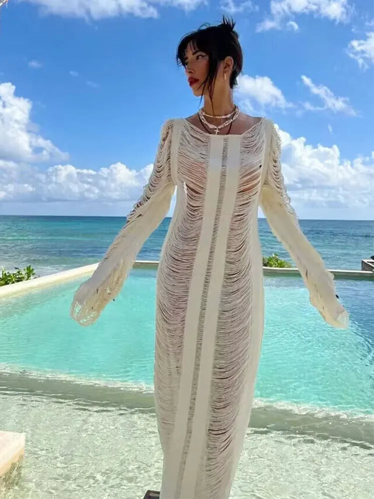 White Knitted Sexy Hollow Out Fringe Beach Maxi Dress 2024 Women Summer Backless Lace-up Beachwear Party Bikini Cover-ups A2414