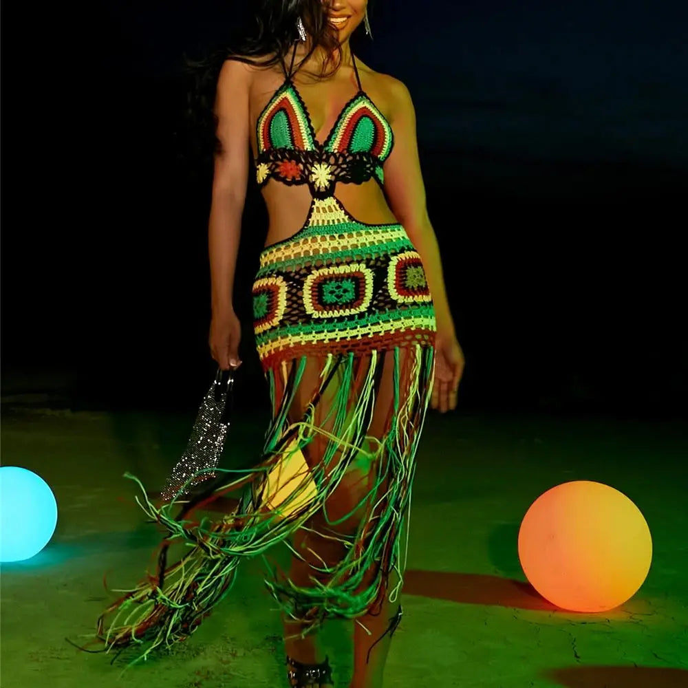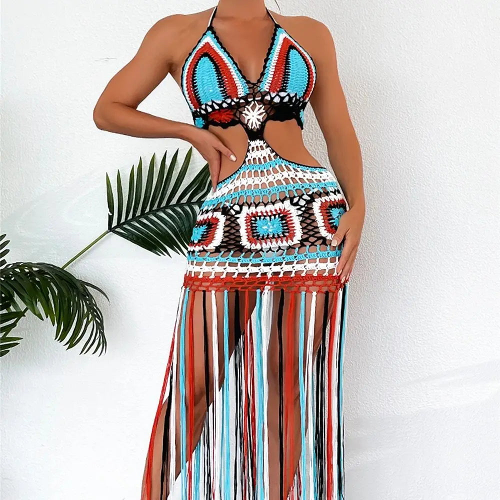 Women Swimsuits Halter Deep V Neck Cover Ups Crochet Binary Colour Swimsuit Tassel Bikini Knit Dress Swimwear Backless Beachwear