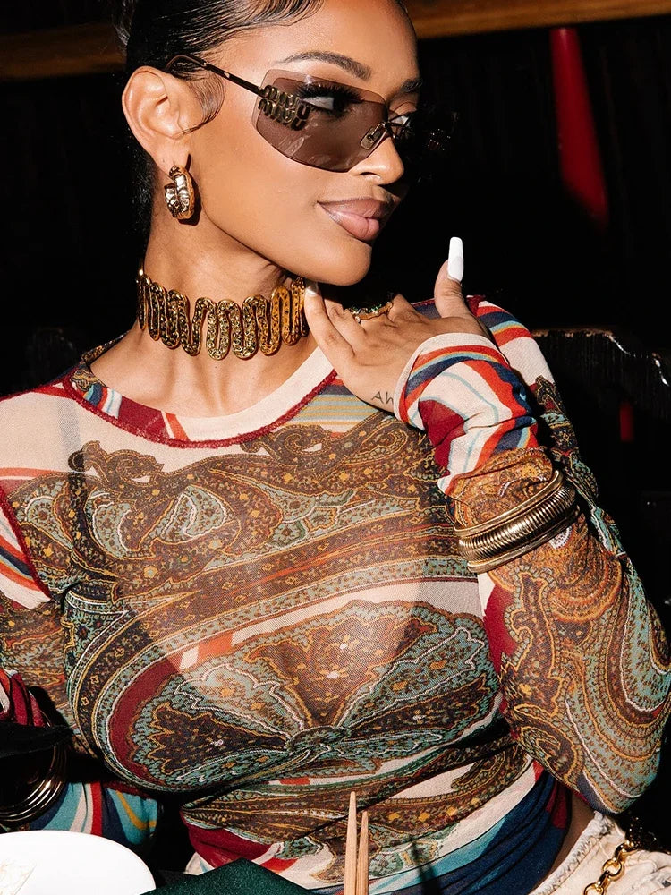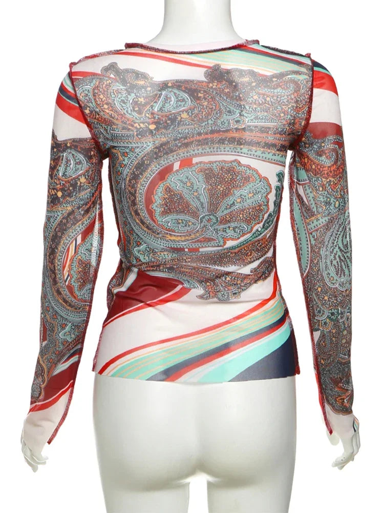 Women Weird Puss Colorful Print Crop Tops See Through 2025 Spring Full Sleeve Stretch Wild Basic Streetwear Hipster Skinny Tops