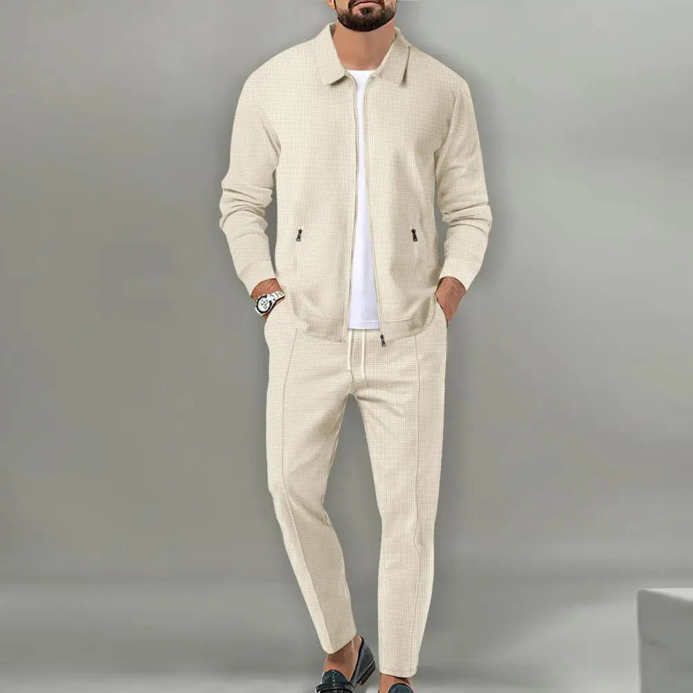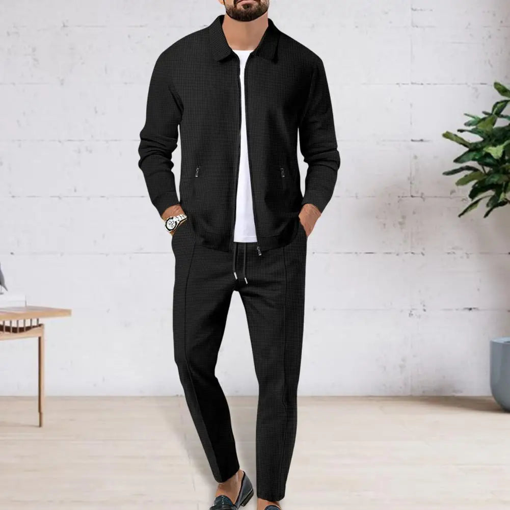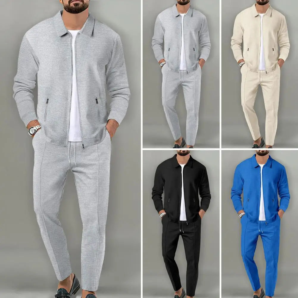 2Pcs/Set Men Outfit Lapel Long Sleeve Zipper Placket Coat Elastic Waist Adjustable Drawstring Long Pants Set