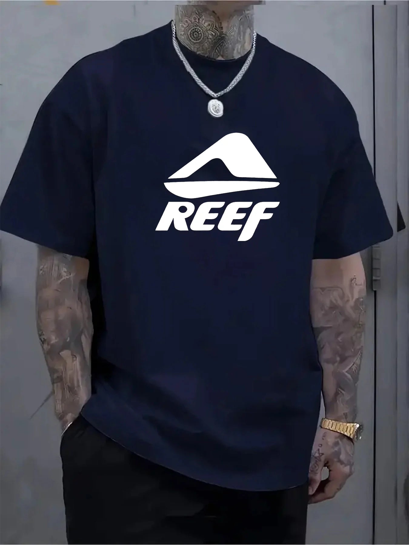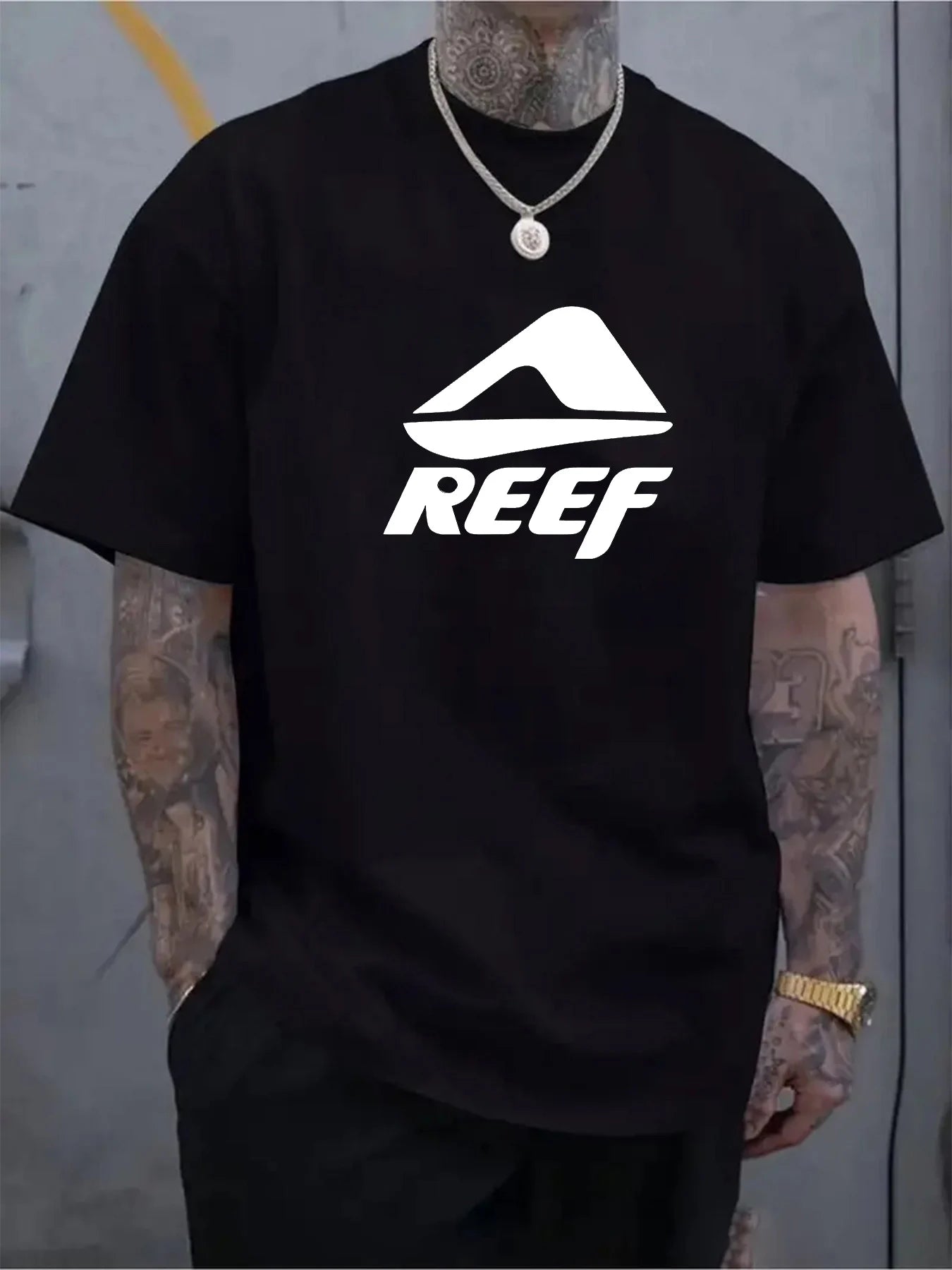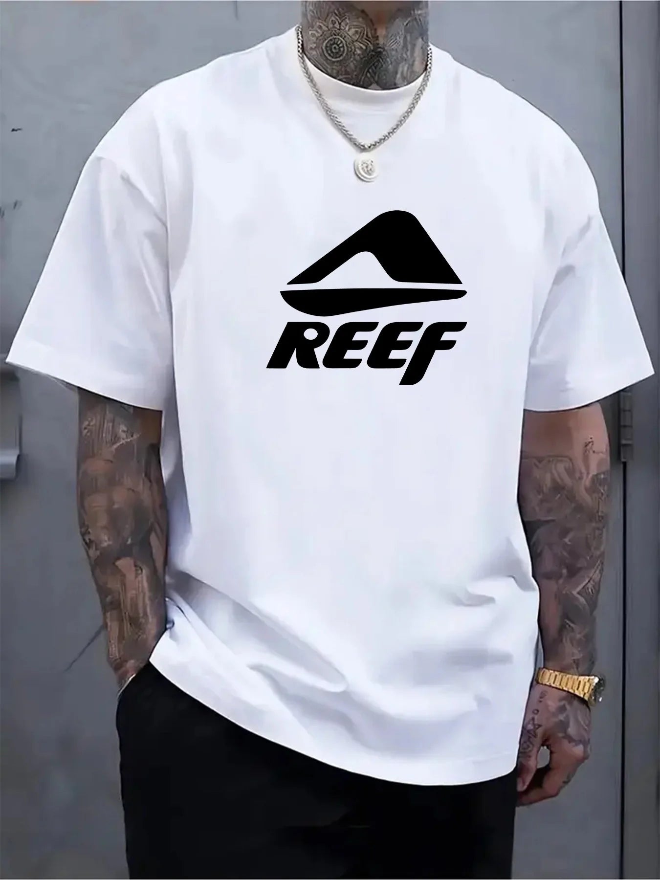 Men's summer 100% pure cotton fashionable casual loose geometric pattern REEF letter printed round neck short sleeved T-shirt