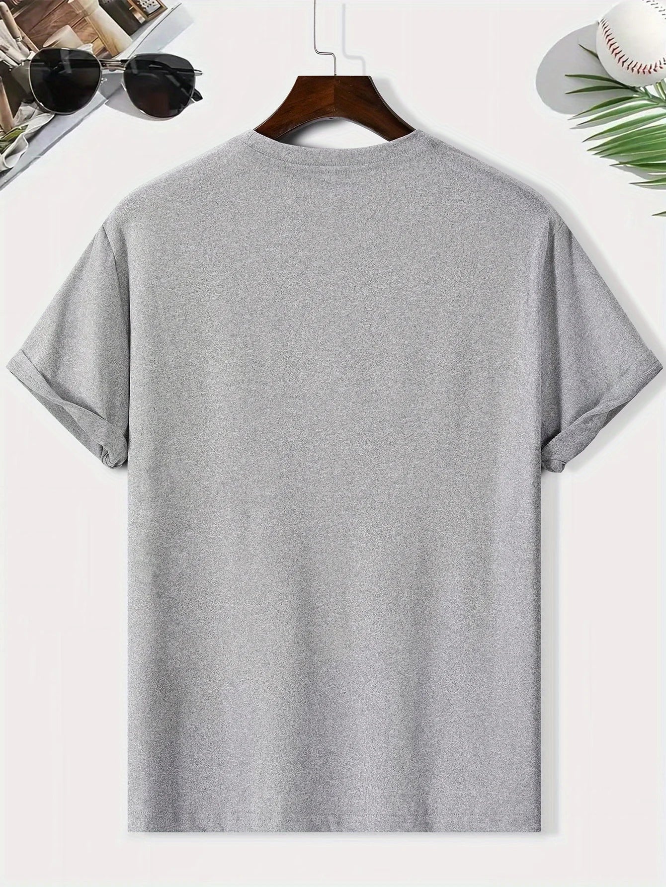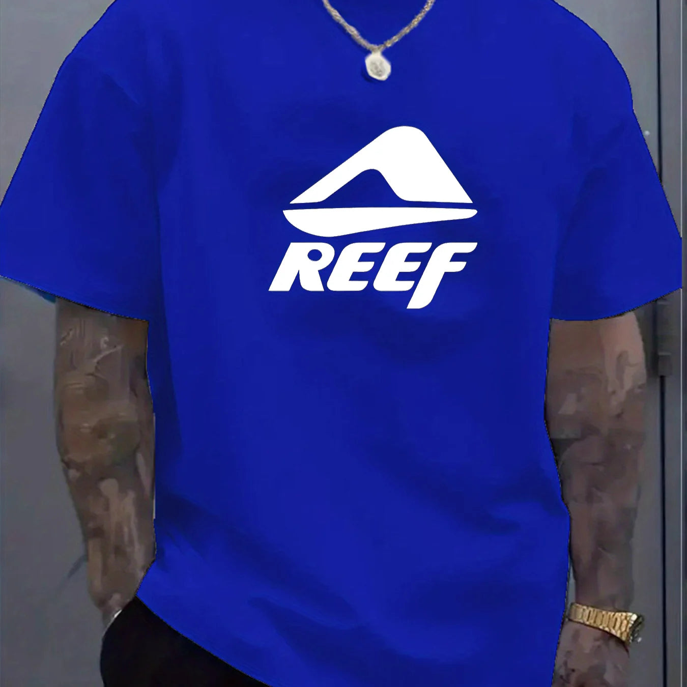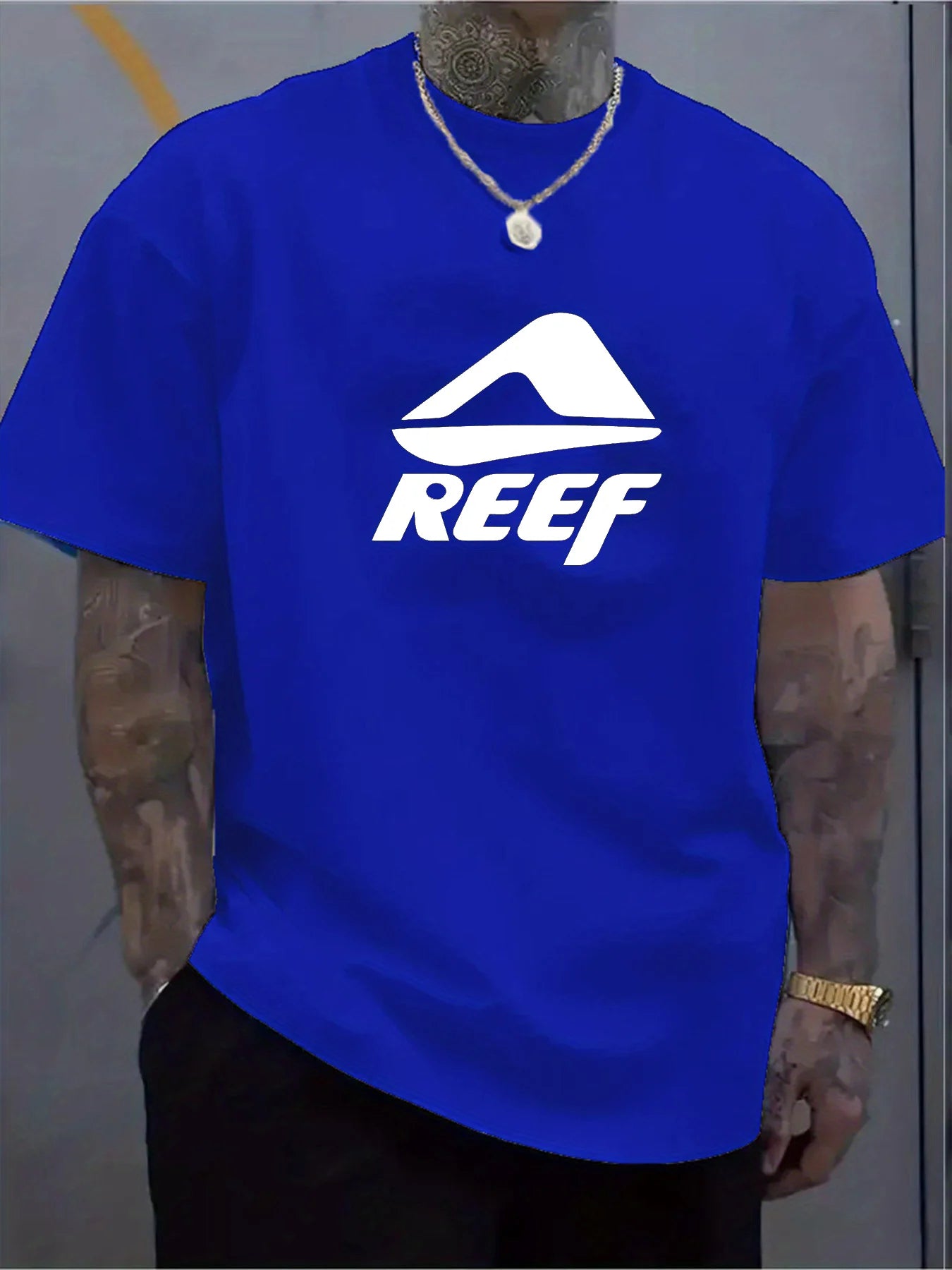 Men's summer 100% pure cotton fashionable casual loose geometric pattern REEF letter printed round neck short sleeved T-shirt