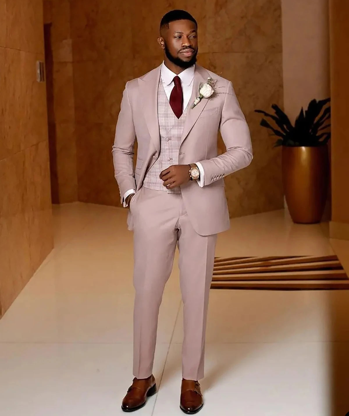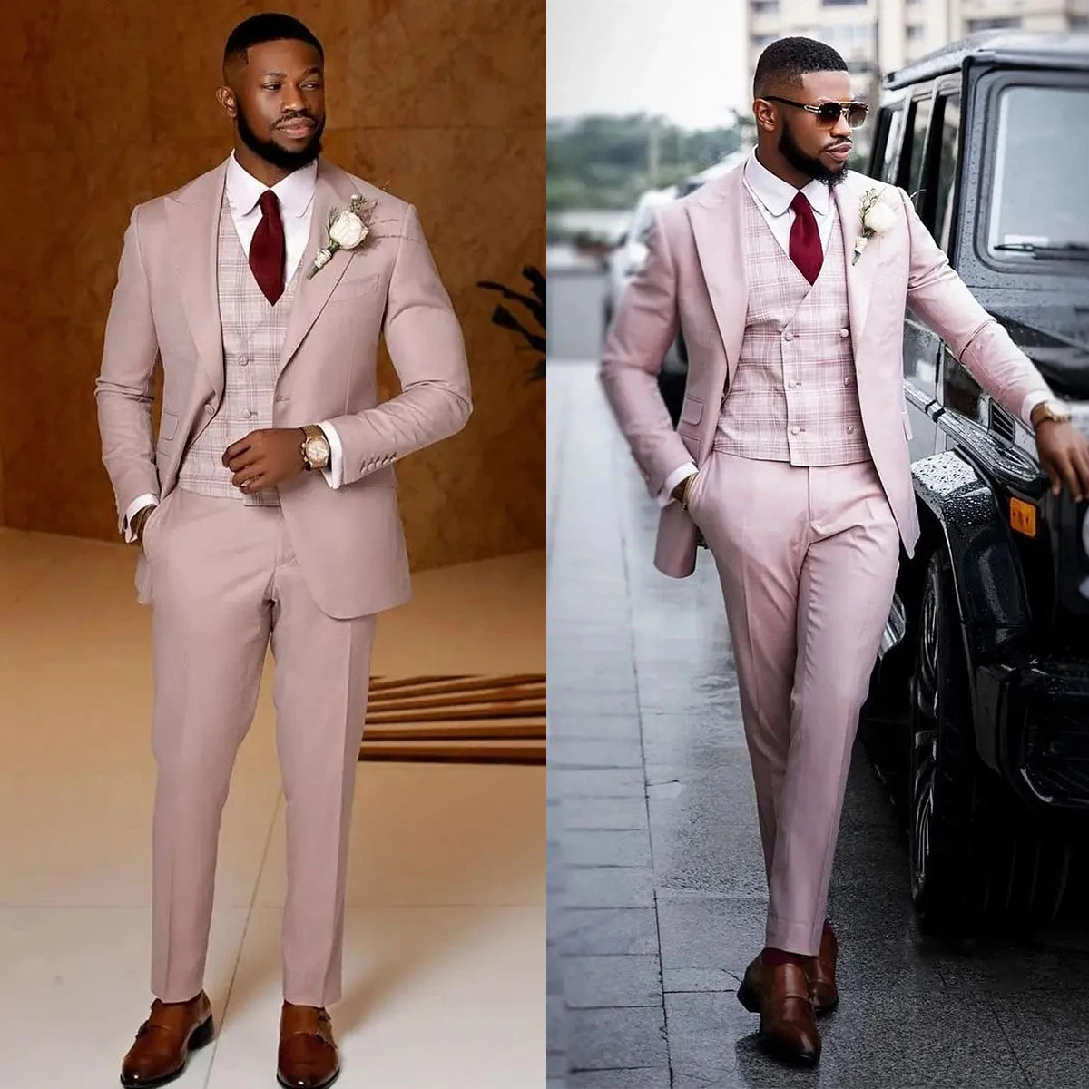 Pink Men's Suits Tailored 3 Pieces Blazer Vest Pants Peaked Lapel Single Breasted Plaid Wedding Groom Customized Plus Size
