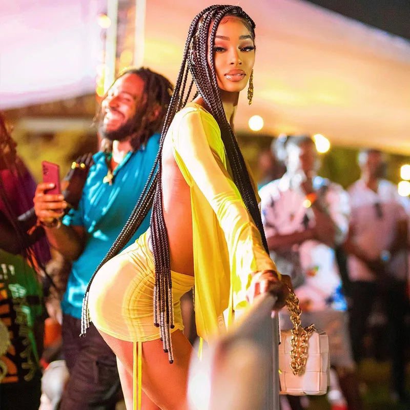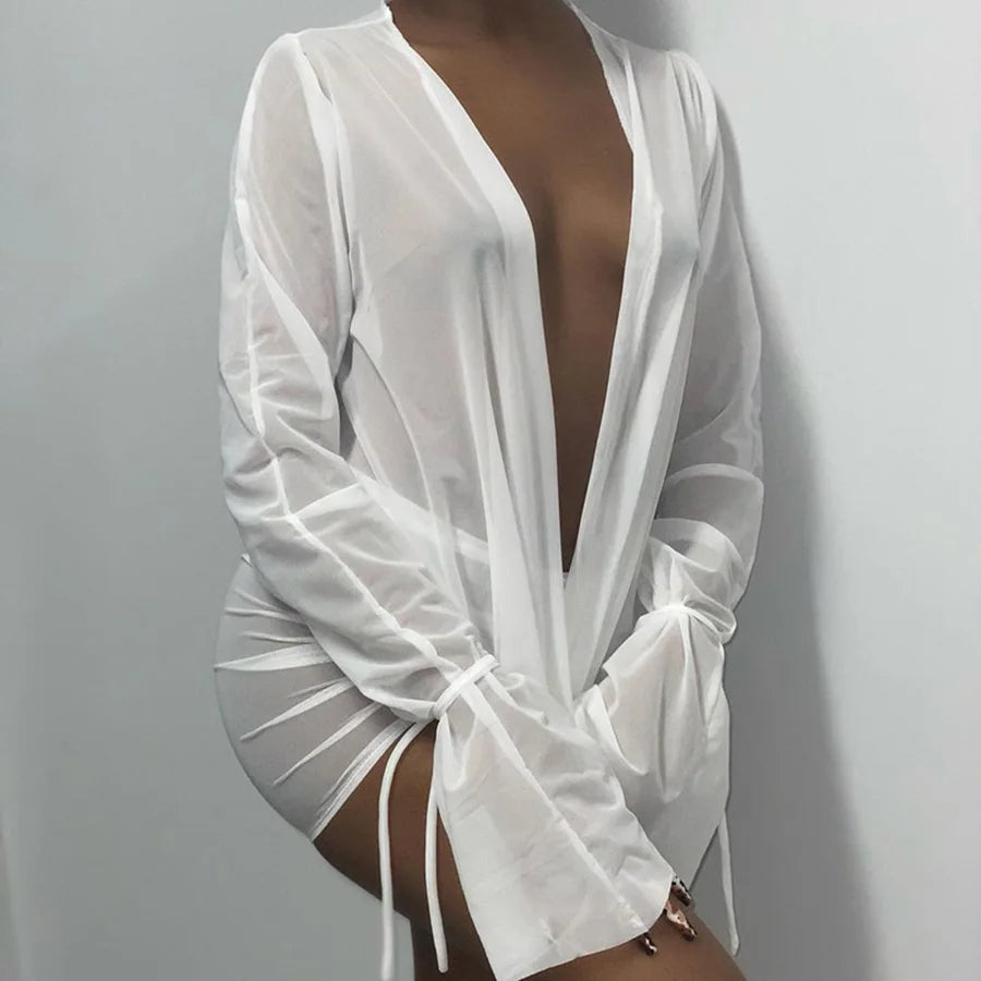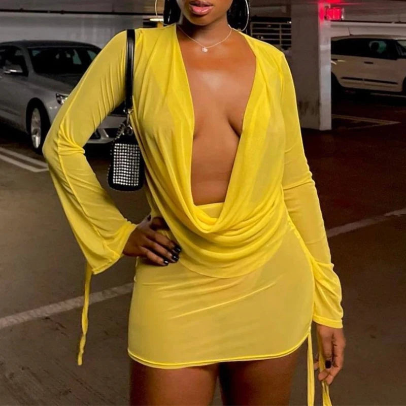 2022 Sexy Mesh Two Piece Set Women Skirt Hipster See Through Flare Long Sleeve Low V-Neck Top And Bandage Drawstring Outfits Y2K