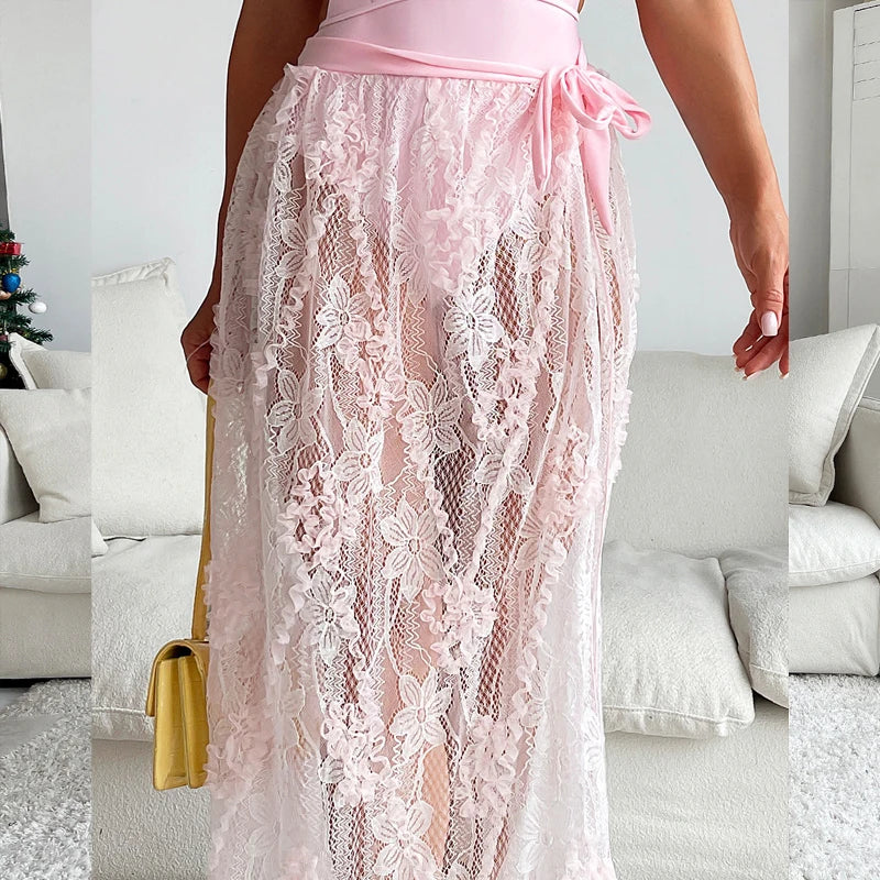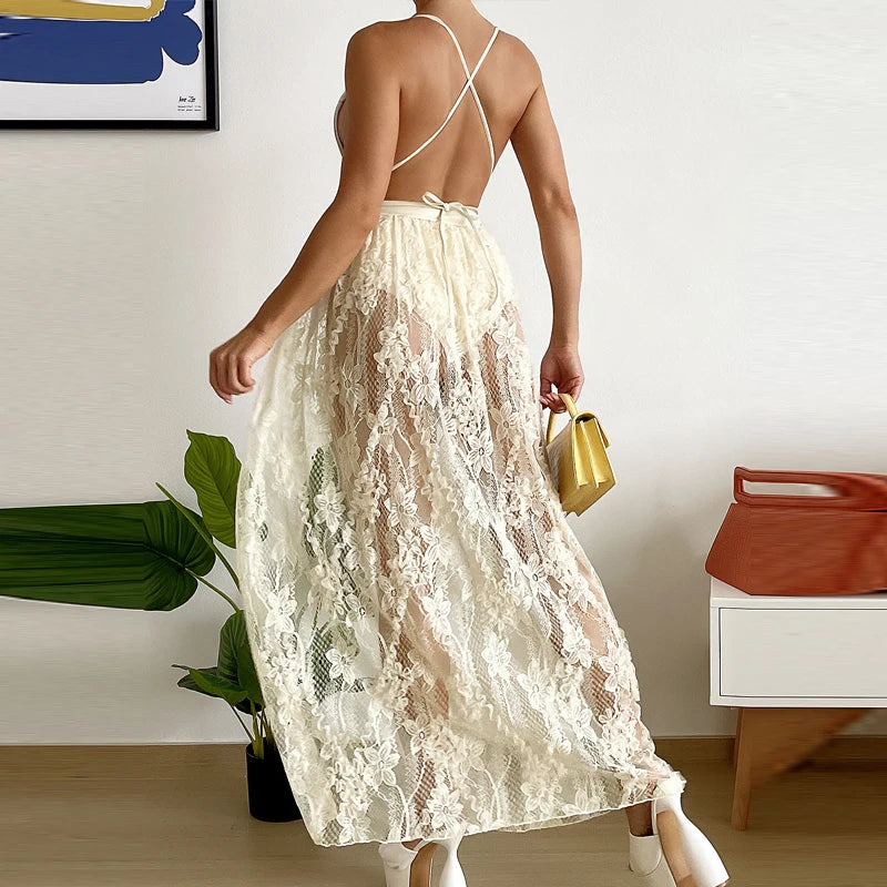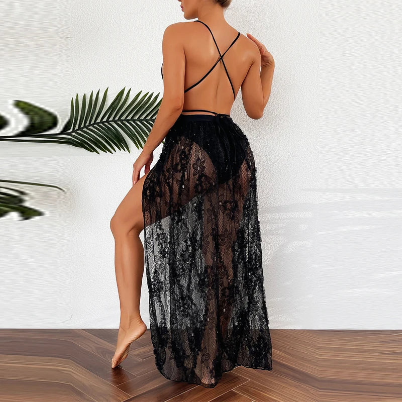 Women Deep V Neck Backless Bandage Cross One Piece Swimsuit Lady Beach Swim Sexy Lace Transparent Skirts & Bodysuit Bikini Set